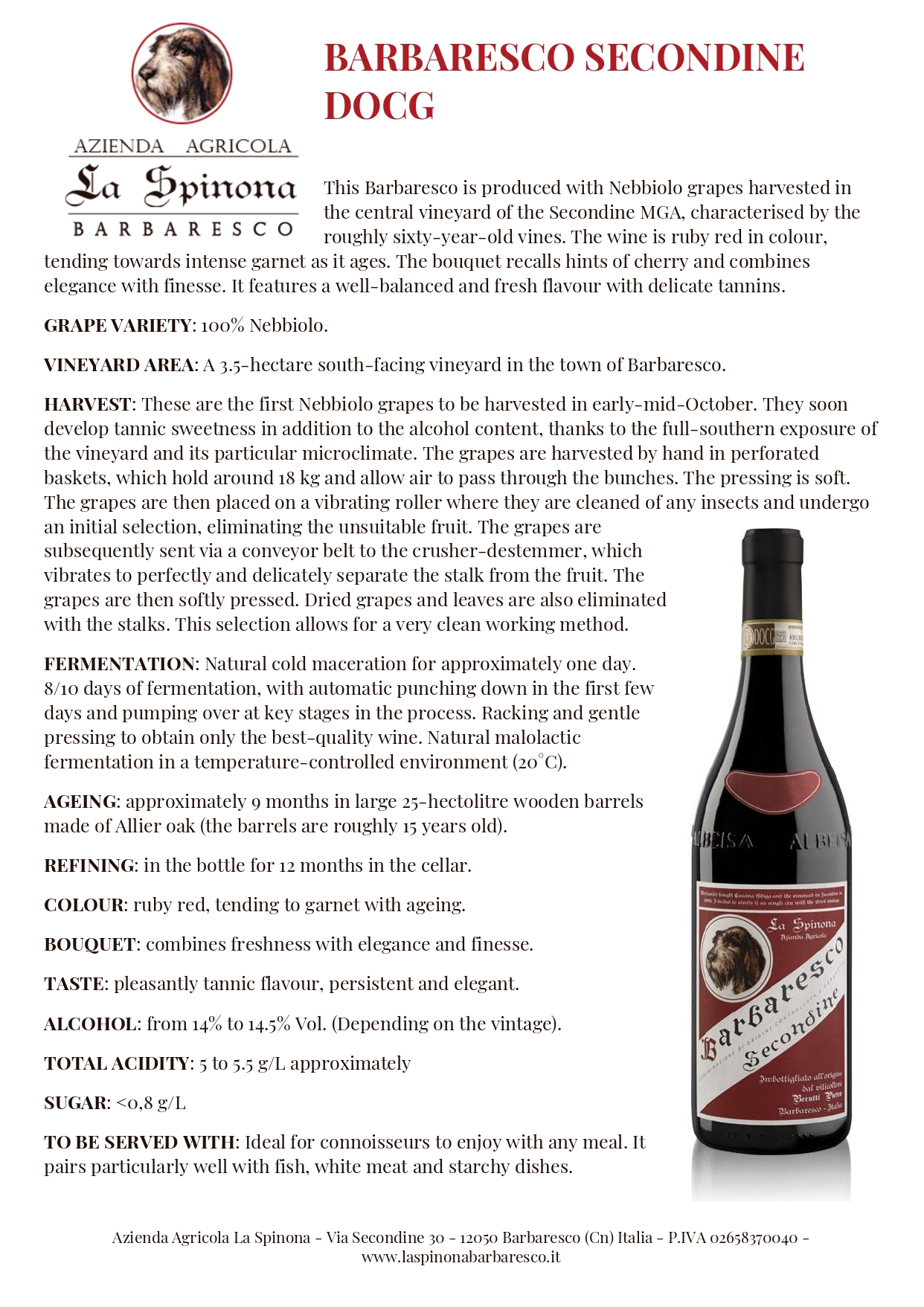 Made from 100% Nebbiolo from 60-year-old vines. Elegant and balanced, with notes of cherries and flowers, delicate tannins, and versatility with both meat and fish.